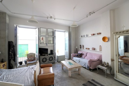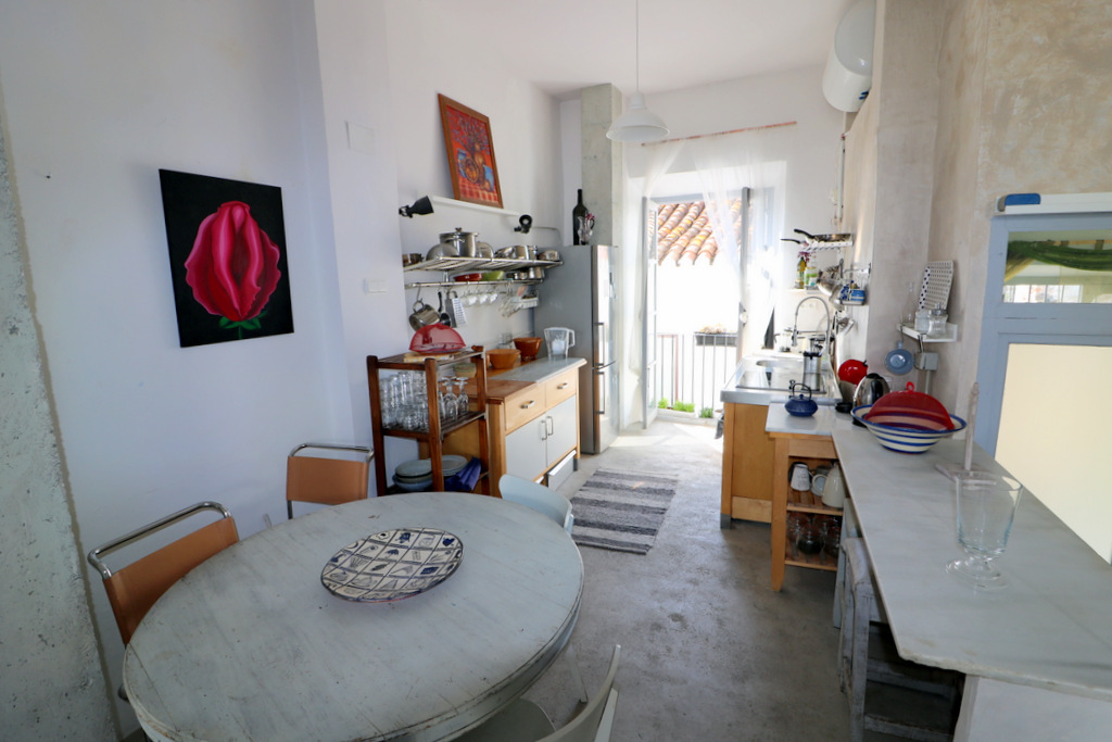 The ground floor has permission for a commercial activity, such as a gallery or perhaps a workshop with a shop front, plus WC and bathroom, while the first floor is an open plan studio apartment, currently furnished as a studio loft with a further mezzanine room.