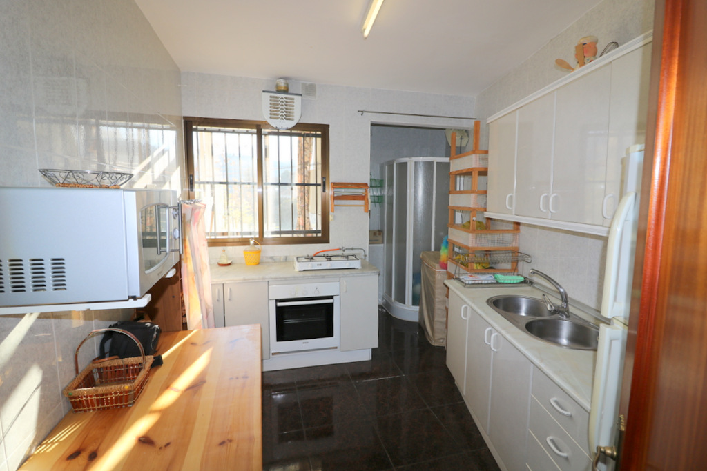 Ground floor: Living area with fireplace, hall with downstairs WC and under stairs storage, bright kitchen with a window into the utility area with large windows and mountain views. Rather quirkily there is a shower on one side of the kitchen, installed there a couple of years ago when the owner began to have difficulty climbing the stairs, but it can easily be removed again for more kitchen space, utility area or storage. On the other side of the kitchen is a double bedroom with built-in wardrobe that could equally be converted into an office or dining room.