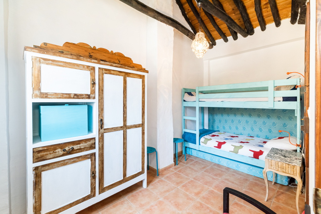 The first floor has two bedrooms: one currently with bunkbeds, so perfect as the kids room or equally as an office; the other with double bed, built-in wardrobe and direct access to the stairs up to a roof top terrace.
